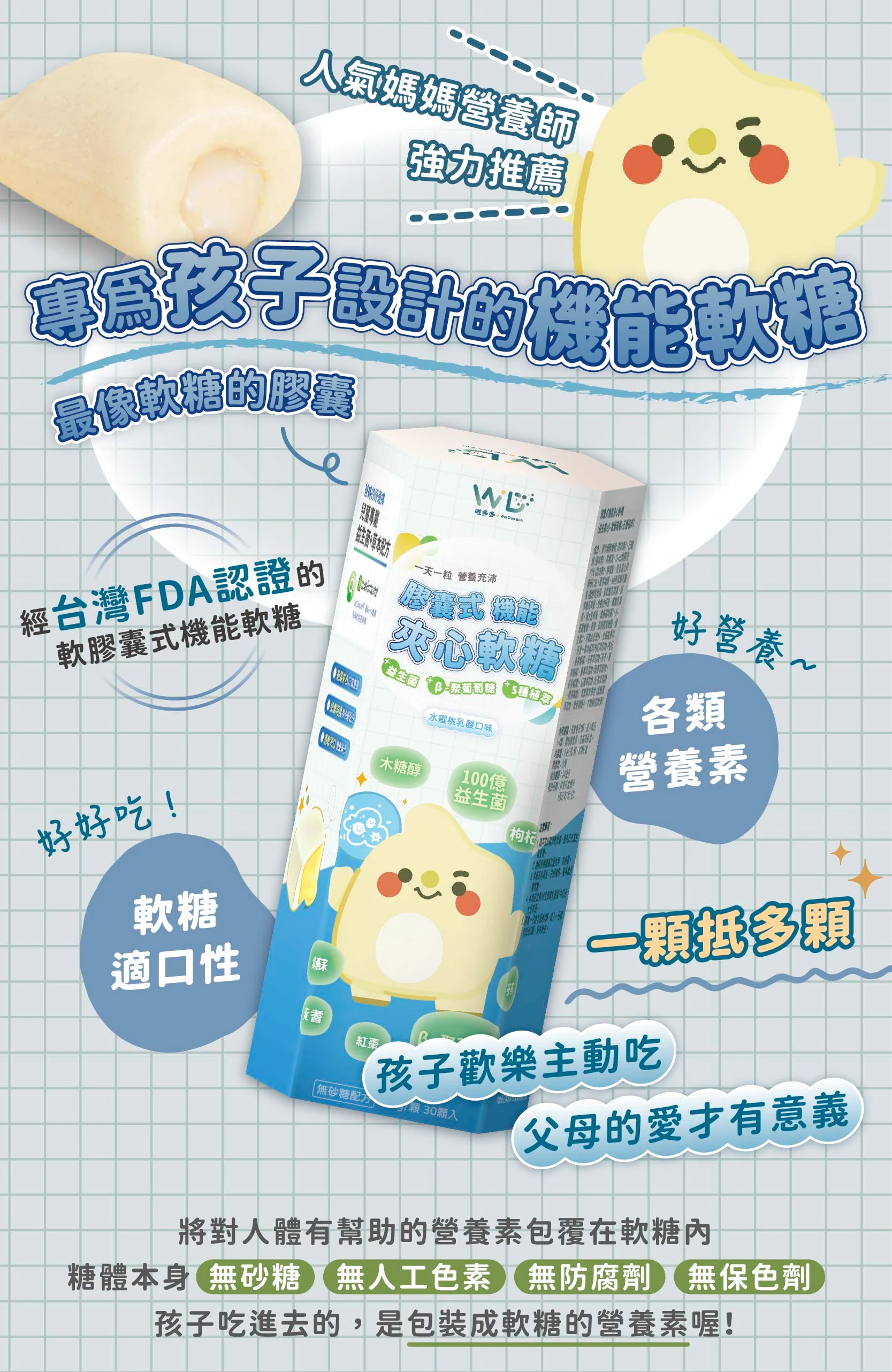 ▲友善劑型:好吃又美味可口的軟糖(口感類似嗨啾),解決吞食膠囊、錠劑、粉包所帶來的不便。