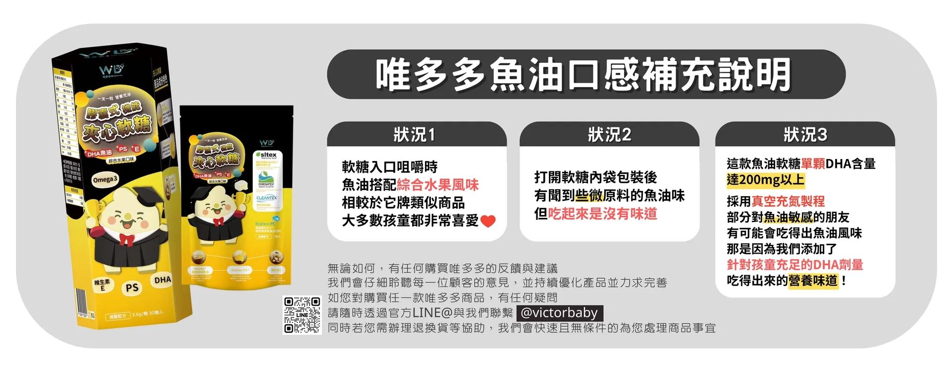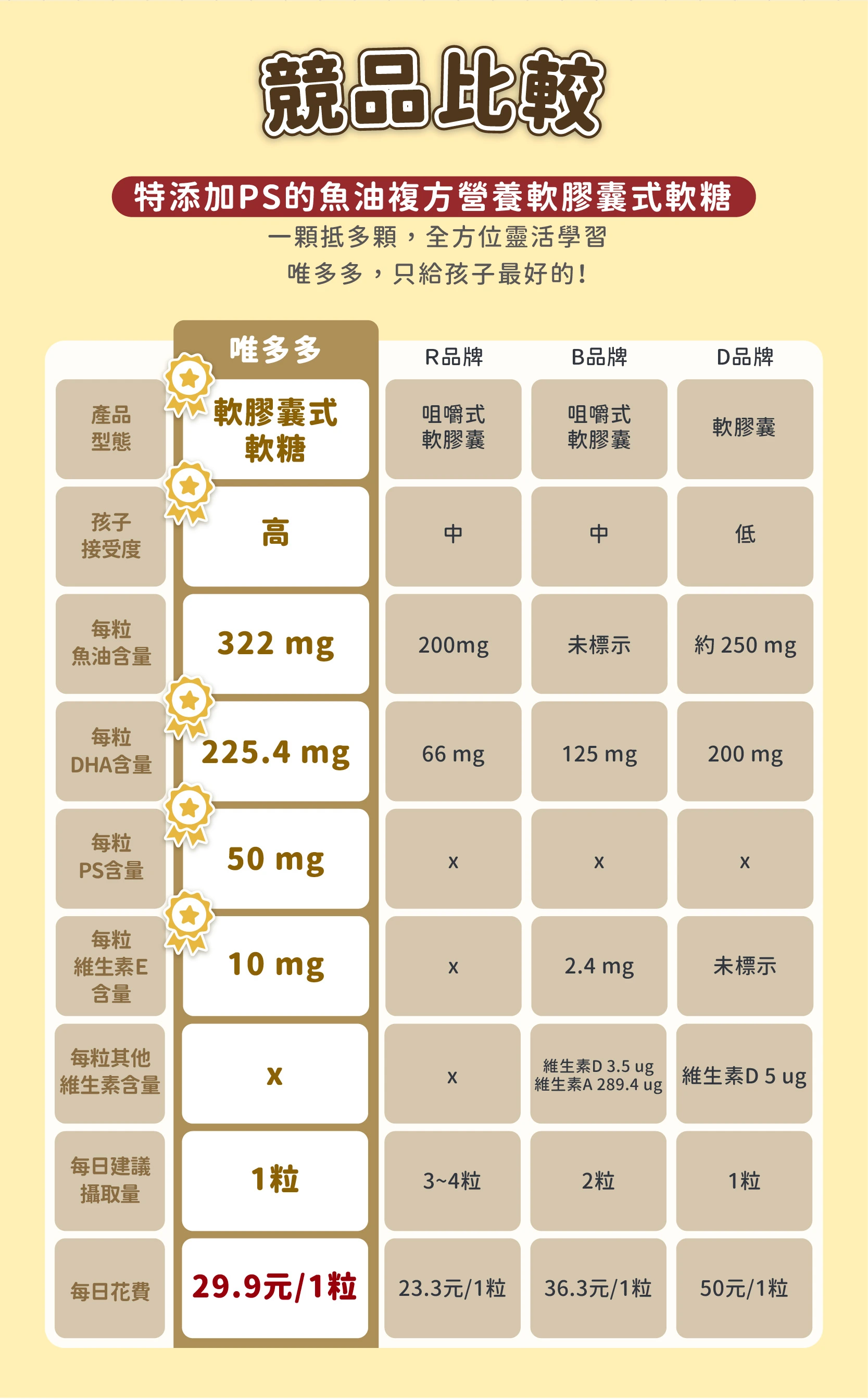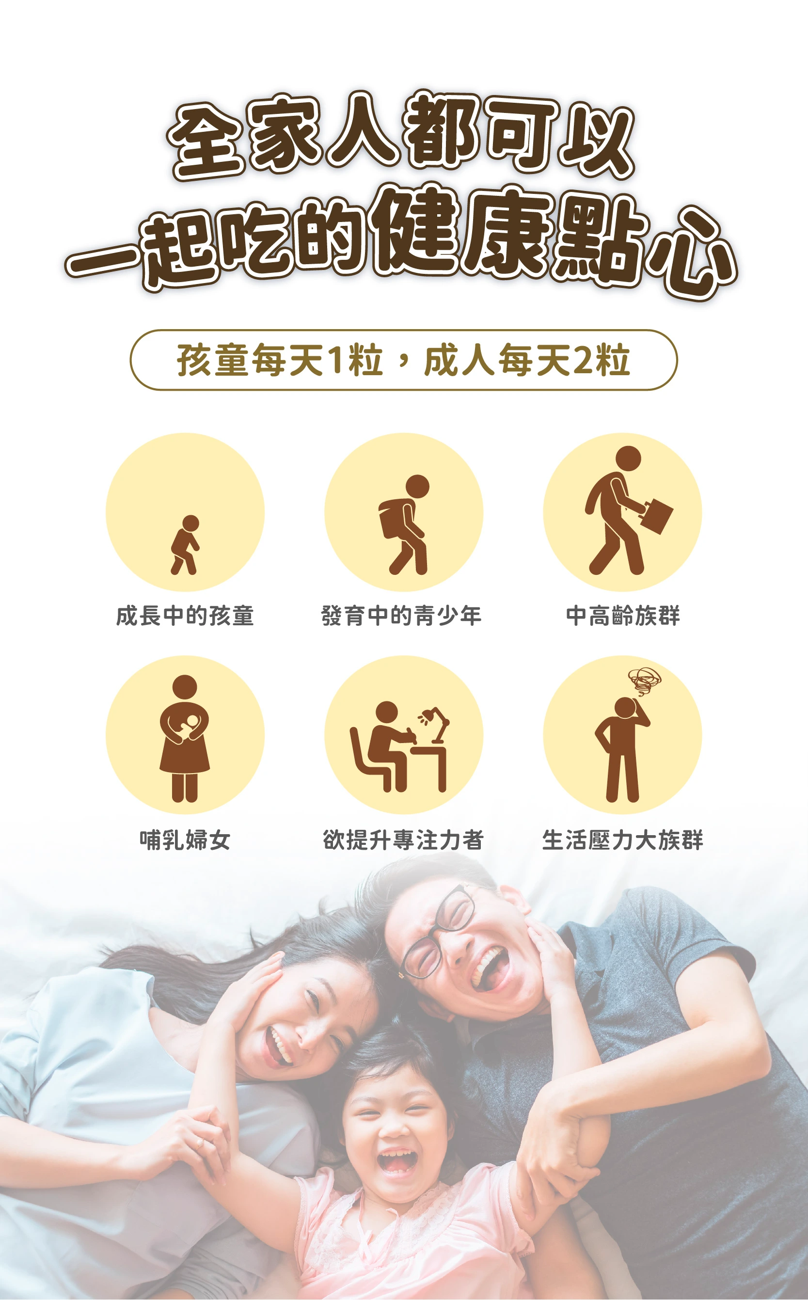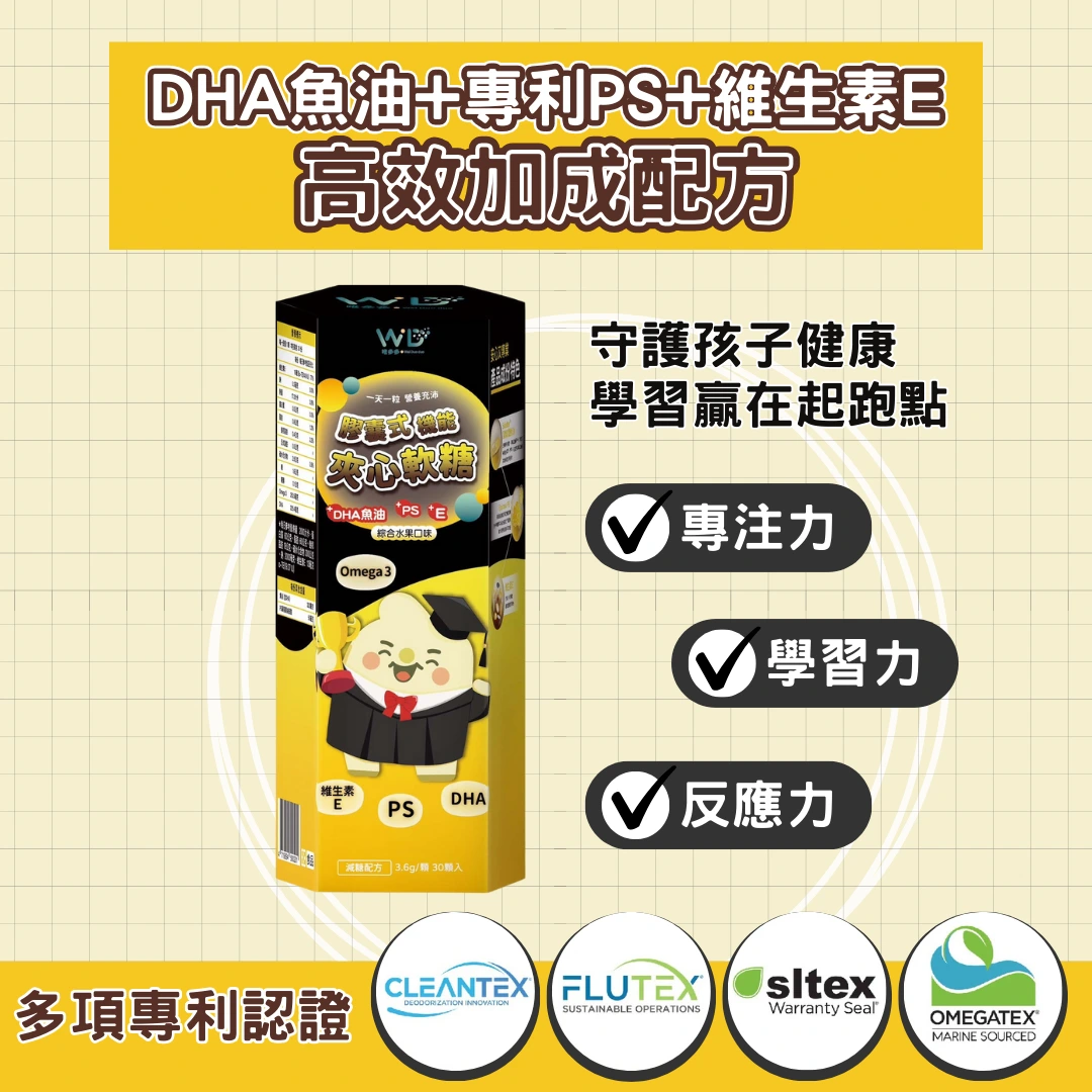讓魚油不只是魚油,文獻指出,於補充DHA魚油時,再加入PS腦磷脂,有著1加1大於2之加分作用,再加入天然維生素E,智慧金三角儼然成形!孩童一天一顆即足量,無需吃多種瓶瓶罐罐,一款即可滿足,高CP值。
